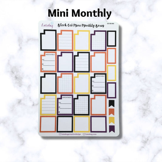 Black Cat, Mini Monthly Boxes, Planner Box Stickers, Functional Halloween Mini Calendar Boxes, Sticker Sheet
