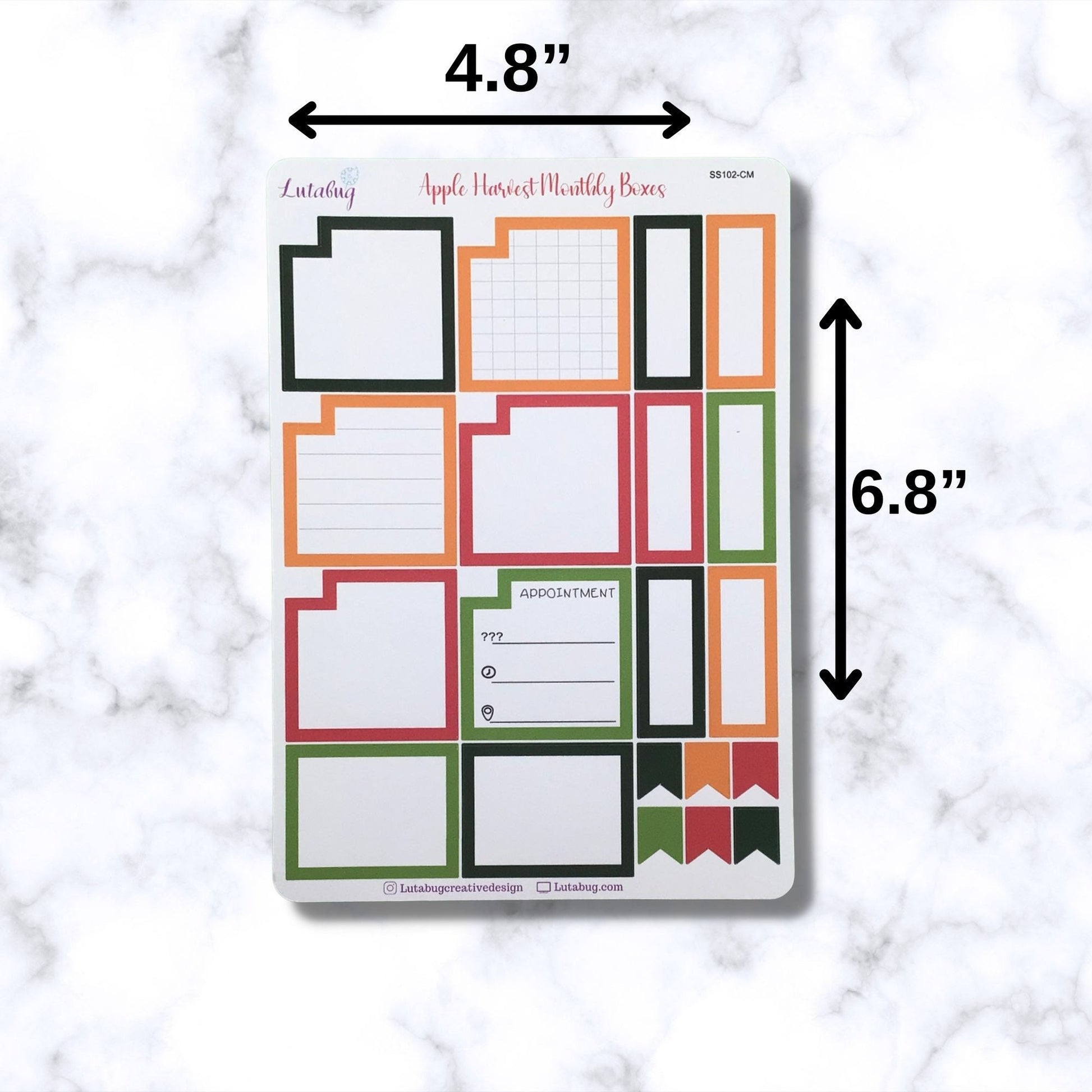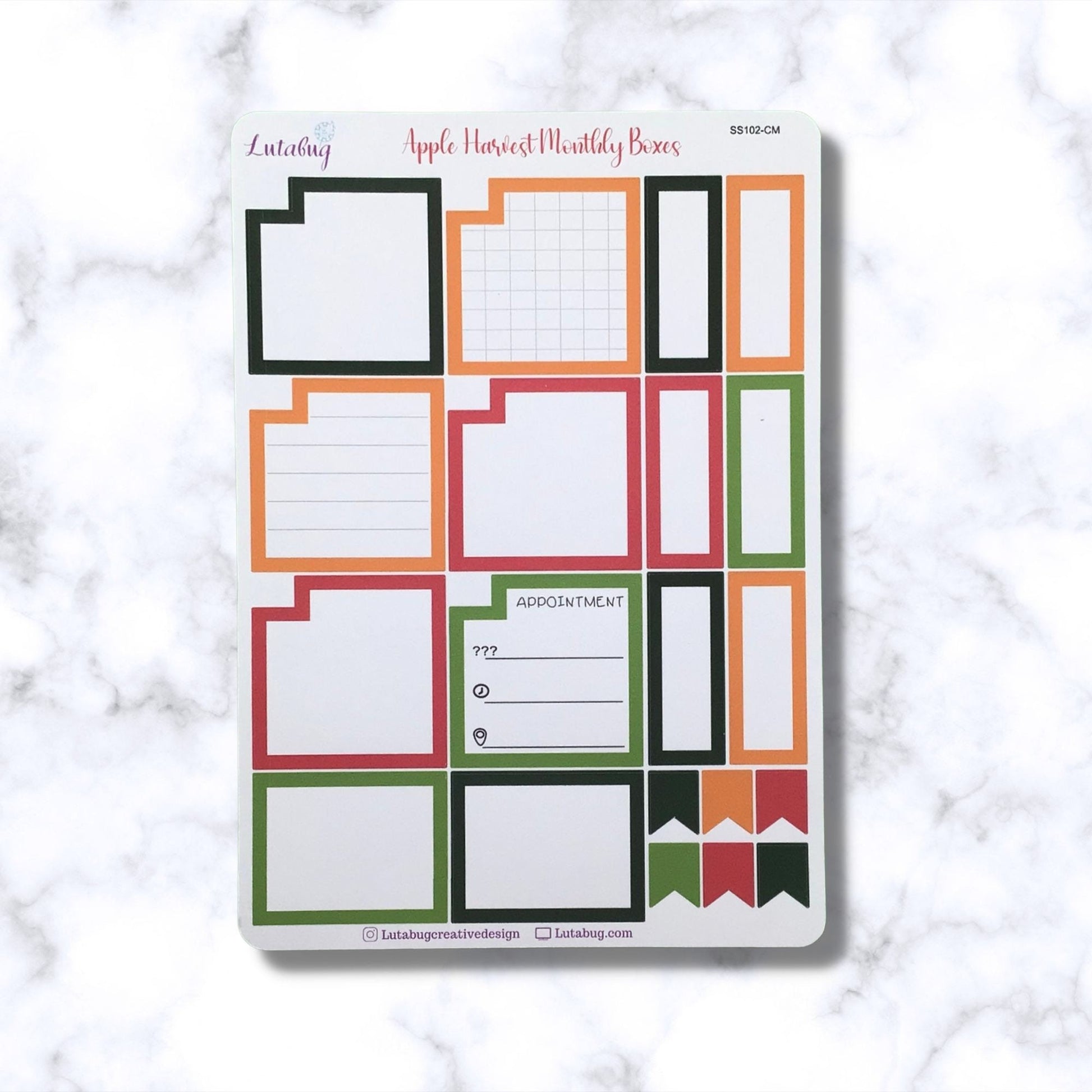 The Apple Harvest monthly planner box stickers are designed to fit the calendar boxes on the monthly pages in Happy Planner classic sizes planners. 2 page sticker sheet set has 40 total pieces in apple red and green, dark green and orange. 12 monthly planner box stickers , (6 blank, 2 lined, 2 grid, and 2 appointment ), 4 half boxes, 12 small boxes and 12 flag stickers. Functional calendar box stickers fit HP classic planners, but could be used in any planner, calendar, scrapbook or journal.