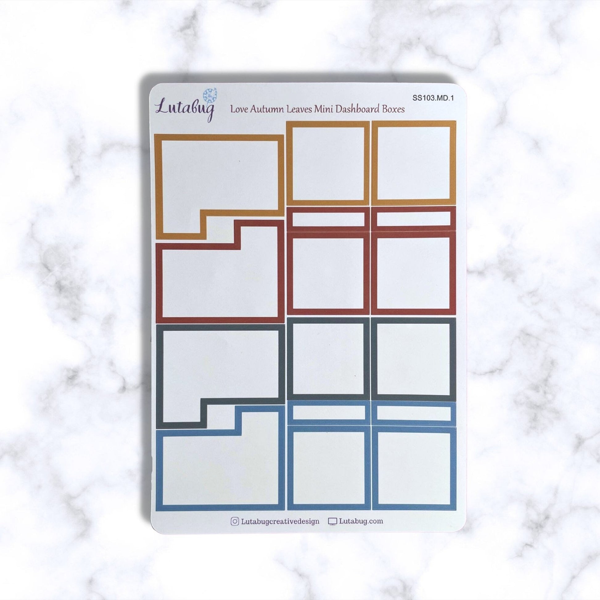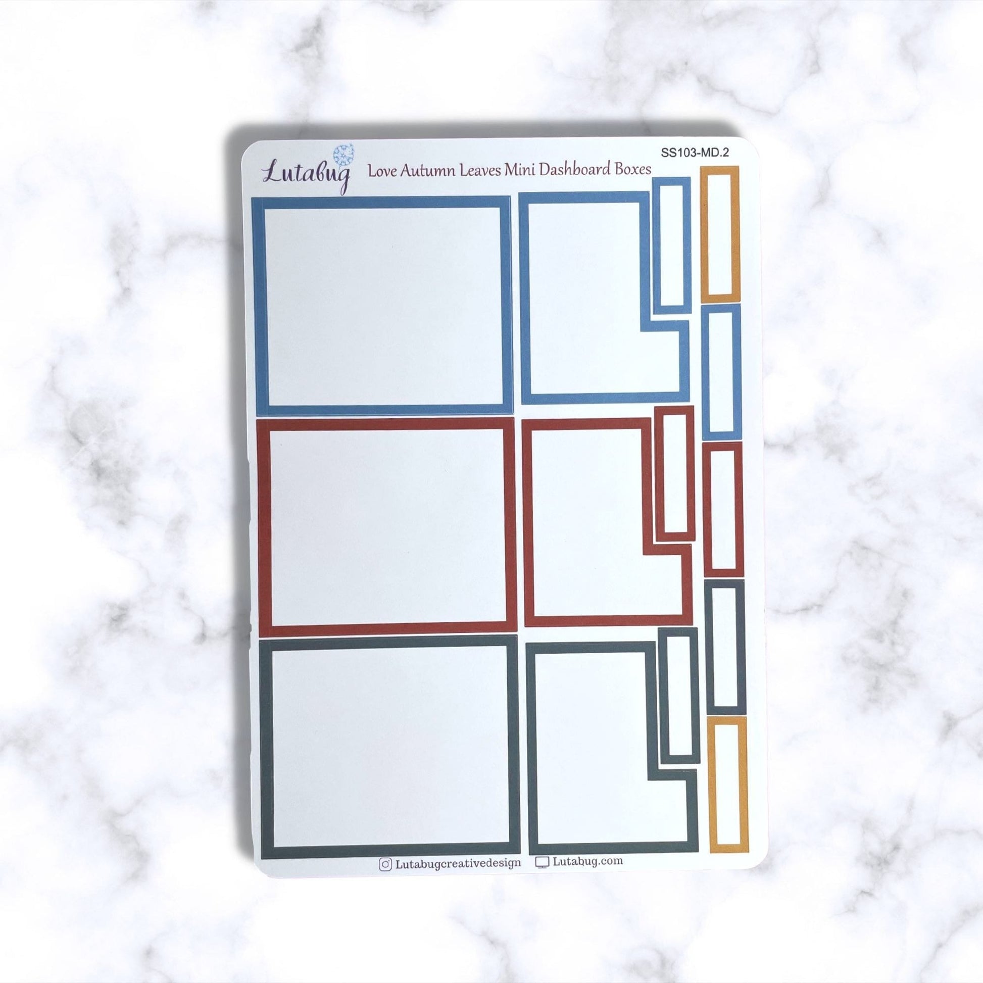 3 page planner sticker kit designed to fit the Mini Dashboard planner. Sticker kit includes 2 pages of 30 planner box stickers: 3 large squares to fit the left page, 7 dashboard full boxes, 8 square boxes and 12 header boxes, and 1 Autumn Leaves deco sheet with 20 hand drawn fall leaves stickers. Use to accent or plan in your planner or journal.