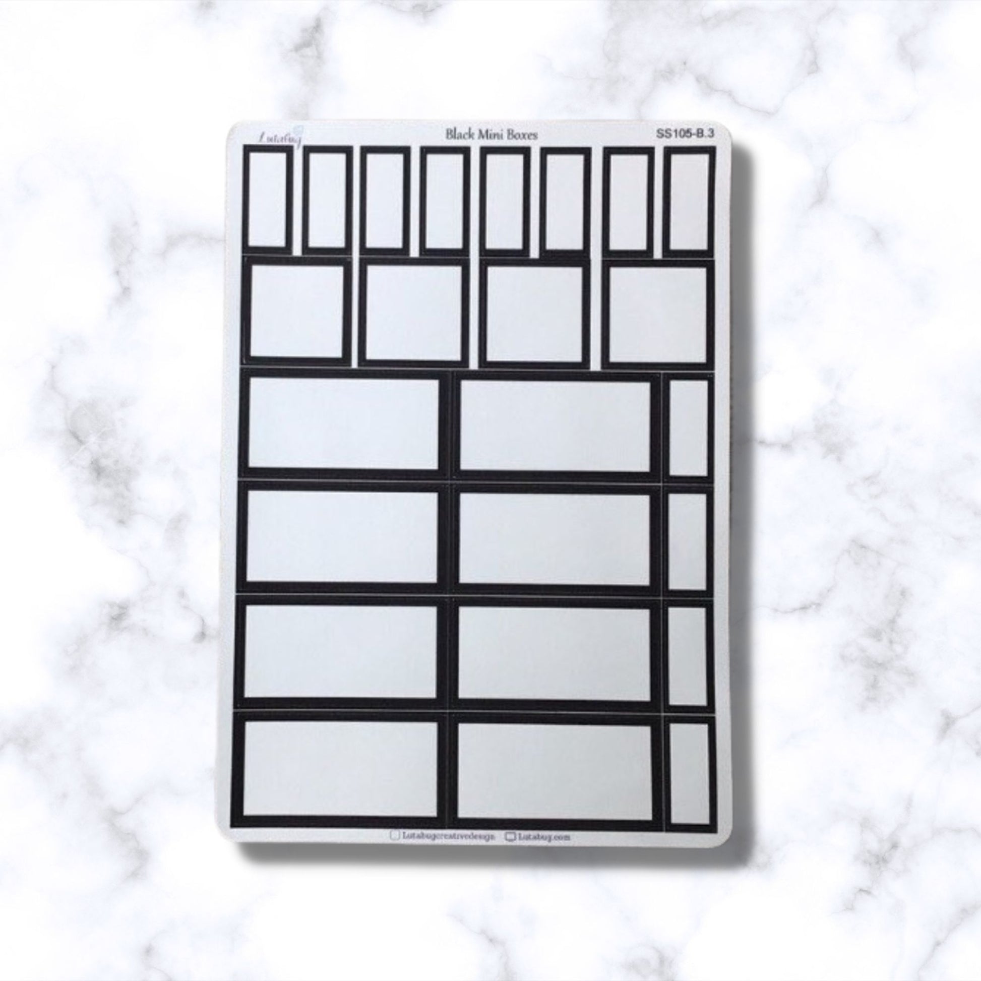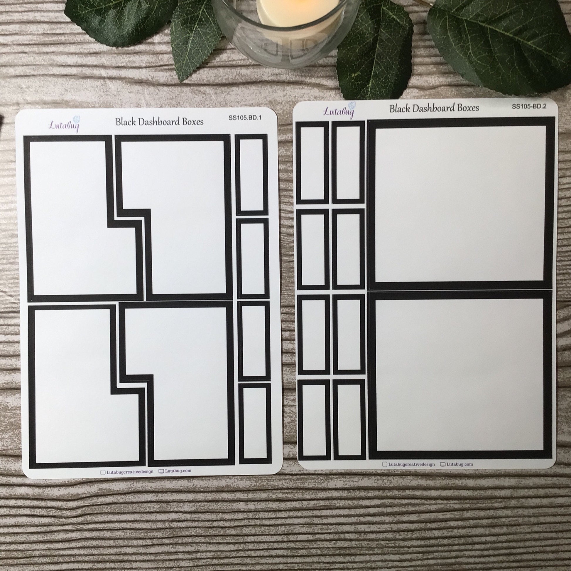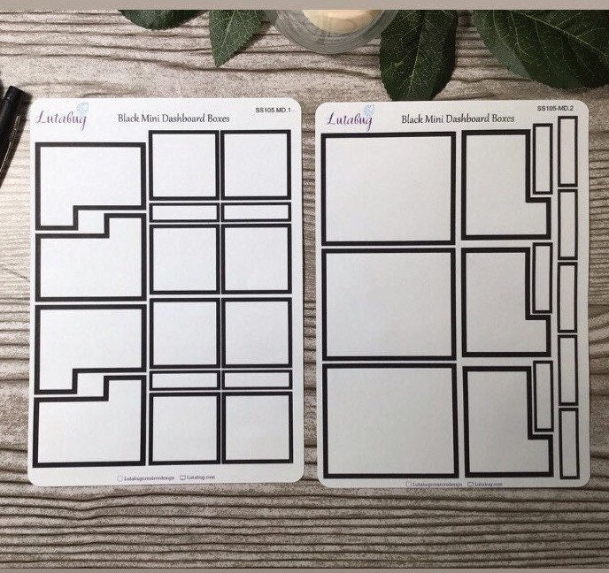 3 page sticker kit is printed on white matte sticker paper includes 1 deco sheet and 2 coordinating box stickers. (Mini kit is 2 pages). Available as a kit, or ala carte. Deco sheet available in white matte or clear glossy options. Choose from coordinating black boxes on white matte sticker paper sized to fit HP Classic, HP Mini, HP Dashboard and HP Mini dashboard.